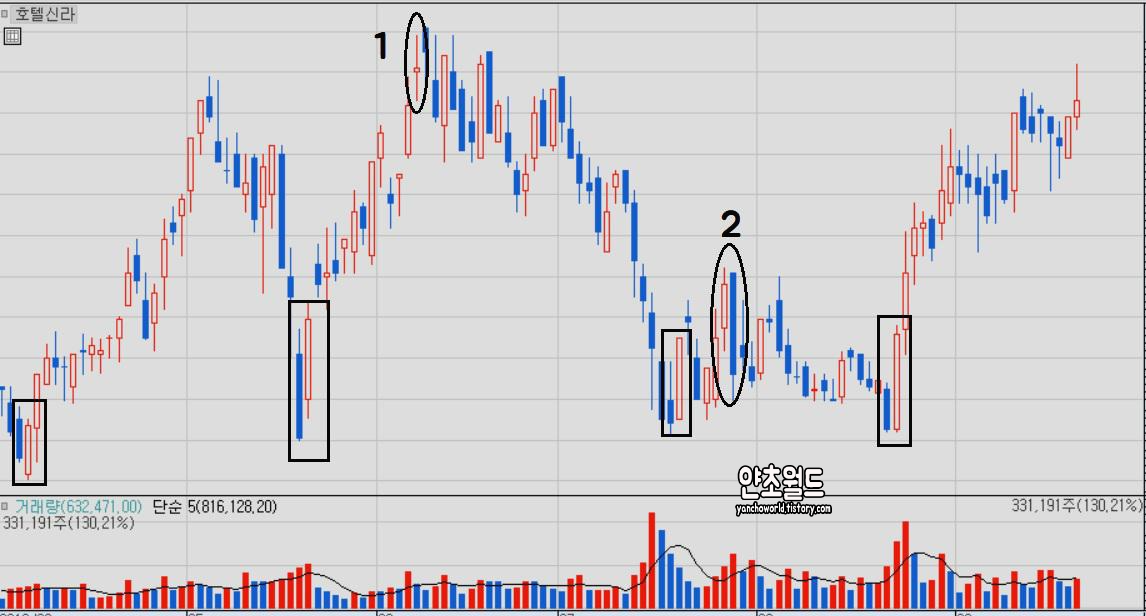 동그라미 2번: 상승추세에 전날 양봉을 감싸는 장대음봉 발생후 상승하지 못하고 횡보.