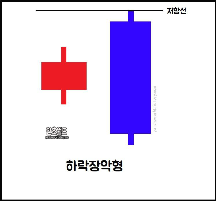 하락장악형은 저항선을 판단하는데 이용되기도함. 두개의 캔들중 더 높은 고가가 저항선이됨. 꼬리는 무관.